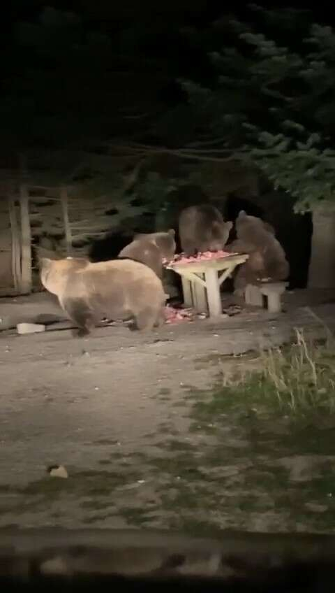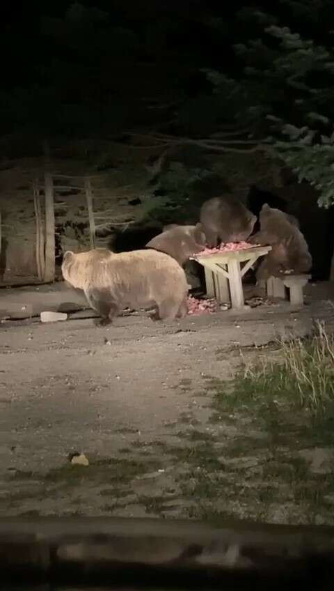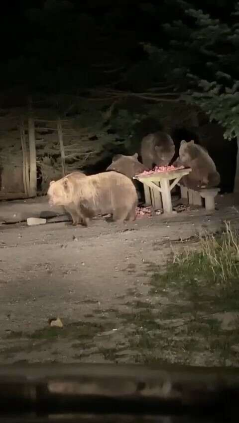 Turistik mekan sahipleri, ayıların aç kalmaması ve işyerlerine zarar vermemesi için banklara ve konteynerlere yemek bıraktı. Akşam saatlerinde ortaya çıkan 4 kişilik ayı ailesi, bankların üzerindeki etlerin keyfini çıkarırken, o anlar da kamerayla kayda alındı.