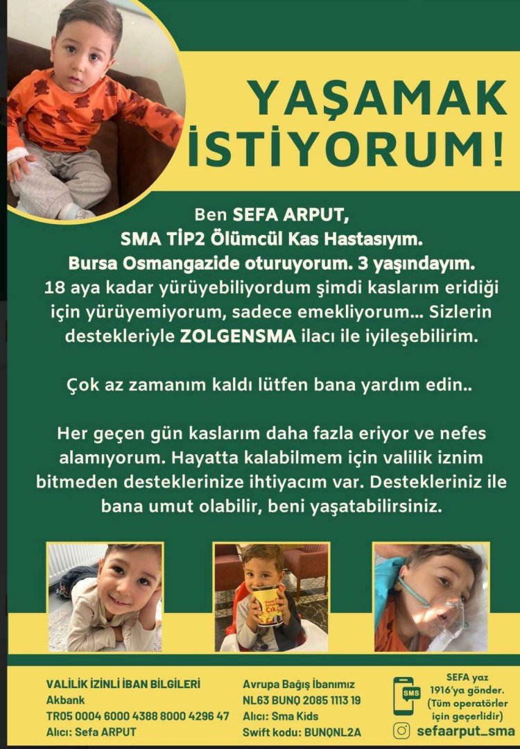 Bursa’da yaşayan 3 yaşındaki Sefa Arput 1 buçuk yaşındayken SMA-TİP2 tanısı konuldu. Arput ailesi Sefa’nın yeniden sağlığına kavuşabileceği günlerin hayallerini kurarken, Sefa için her geçen gün zaman daralıyor. Sefa'nın tedavisi için gerekli olan ücretin henüz yüzde 67'si toplanabildi.
