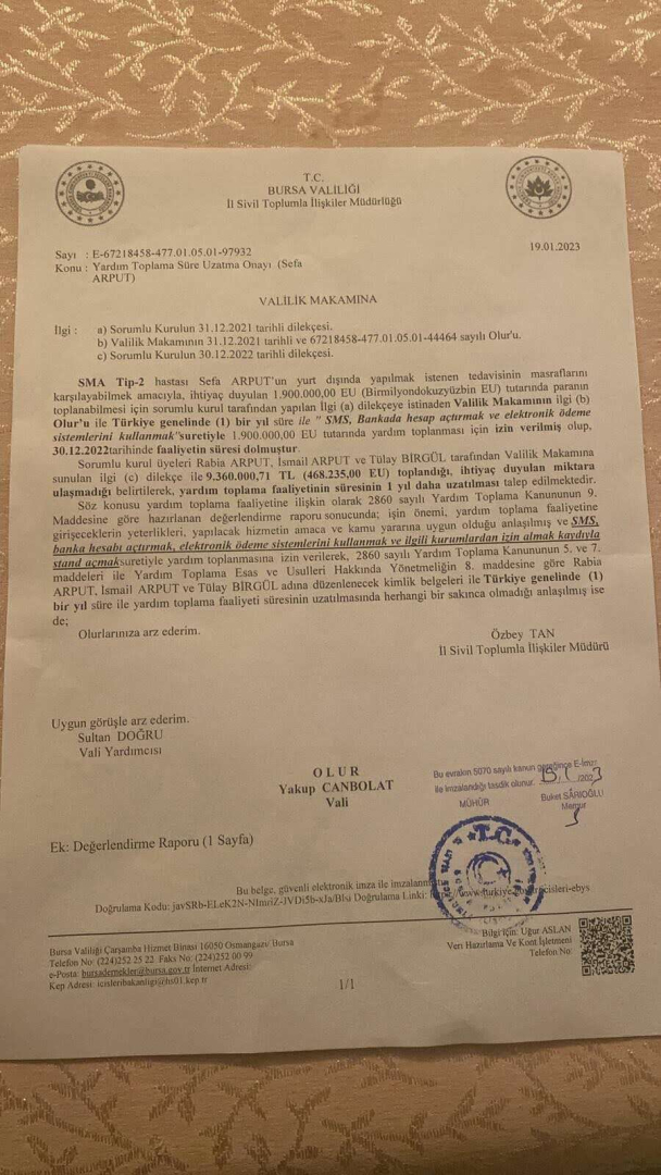 Anne Arput: “Valilik izinli kampanyamız var ama cihazlara bağlı olmadığı için çok ciddiye almıyorlar bebeğimizi. Bizim tek isteğimiz cihazlara bağlanmadan Sefa’nın iyileşmesi. Valilikten aldığımız ikinci izin. Kampanya 19 aydır devam ediyor. Maalesef ki valilik izninin bitmesine 5 ay kaldı. Üçüncü izni alamayacağız, bu sebeple paranın toplanması gerekiyor. İlacın en kısa sürede Sefa’ya ulaşmazsa Sefa, ileri zamanda yutkunma kasları ve nefes alma kaslarını kullanamayacak. Artık emeklerken gücü tükeniyor, kasları gittikçe zayıflayıp hareket edebilme kabiliyetini kaybedebilir. Bunun sonucuda makinalara bağlanacağı anlamına geliyor.” İfadelerini kullandı.