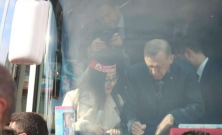 Bursa mitingi için şehre gelen Cumhurbaşkanı Recep Tayyip Erdoğan, otobüsünün önünü kesen İstanbul Teknik Üniversitesi öğrencisi Kübra Yılmaz’ın isteğini kırmadı. Cumhurbaşkanı Erdoğan’ın “Daha Adil Bir Dünya Mümkün” adlı kitabını imzalatan üniversite öğrencisi sevinç gözyaşlarına boğuldu. Erdoğan’ın otobüse davet ederek kitabını imzaladığı genç kız yaptığı açıklamada, “Kitabı gösterdim, imzalatmak istiyorum' dedim. Sevindi böyle devam dedi” şeklinde konuştu