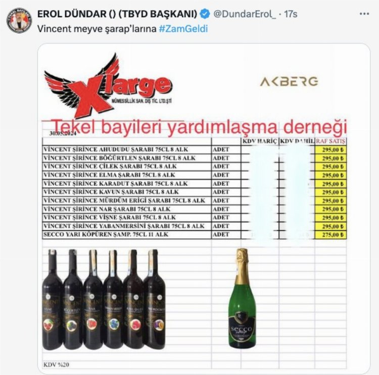 Tekel Bayileri Yardımlaşma Derneği (TBYD) Başkanı Erol Dündar, sosyal medya üzerinden bir şarap grubuna yüzde 20 zam yapıldığını duyurdu. Bu zam sonucunda, grubun en ekonomik şarabı 275 TL'ye çıktı.