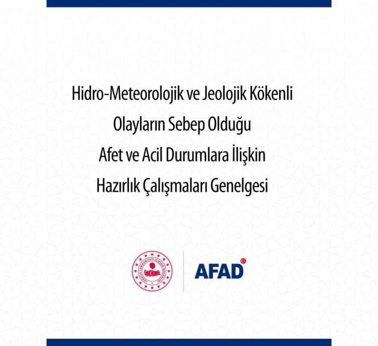 Afet ve Acil Durum Yönetimi Başkanlığı (AFAD) sosyal medya hesabından yaptığı paylaşımda ‘Hidro-Meteorolojik ve Jeolojik Kökenli Olayların Sebep Olduğu Afet ve Acil Durumlara İlişkin Hazırlık Çalışmaları’ konulu genelgenin yayımlandığını duyurdu.
