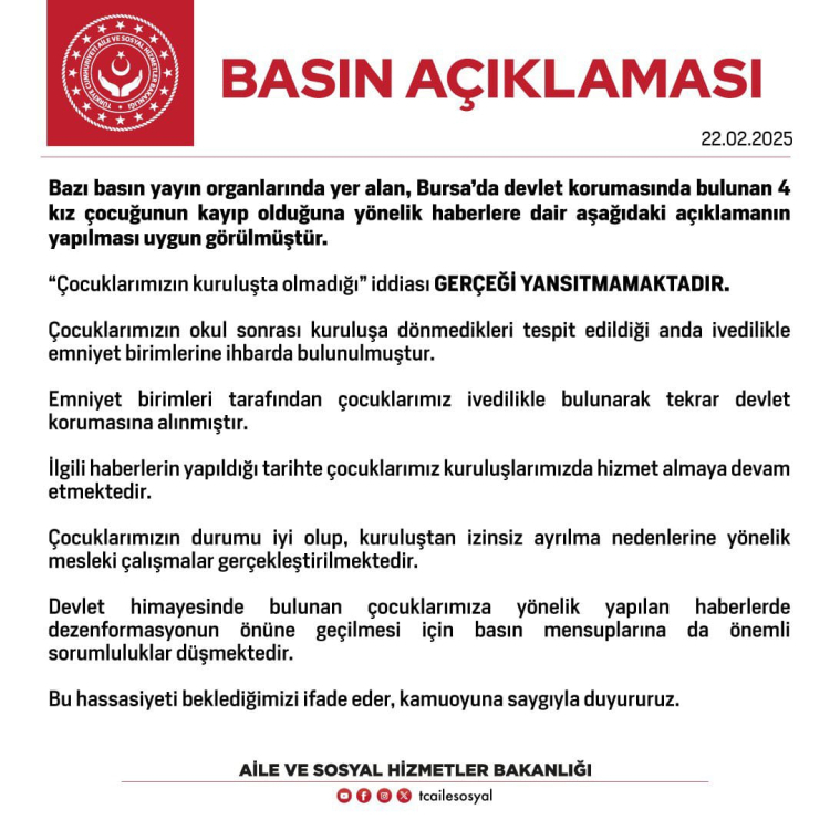 Konuyla ilgili Aile ve Sosyal Hizmetler Bakanlığından yapılan açıklamada, "Bazı basın yayın organlarında yer alan, Bursa’da devlet korumasında bulunan 4 kız çocuğunun kayıp olduğuna yönelik haberlere dair aşağıdaki açıklamanın yapılması uygun görülmüştür. ‘Çocuklarımızın kuruluşta olmadığı’ iddiası gerçeği yansıtmamaktadır. Çocuklarımızın okul sonrası kuruluşa dönmedikleri tespit edildiği anda ivedilikle emniyet birimlerine ihbarda bulunulmuştur. Emniyet birimleri tarafından çocuklarımız ivedilikle bulunarak tekrar devlet korumasına alınmıştır. İlgili haberlerin yapıldığı tarihte çocuklarımız kuruluşlarımızda hizmet almaya devam etmektedir. Çocuklarımızın durumu iyi olup, kuruluştan izinsiz ayrılma nedenlerine yönelik mesleki çalışmalar gerçekleştirilmektedir. Devlet himayesinde bulunan çocuklarımıza yönelik yapılan haberlerde dezenformasyonun önüne geçilmesi için basın mensuplarına da önemli sorumluluklar düşmektedir. Bu hassasiyeti beklediğimizi ifade eder, kamuoyuna saygıyla duyururuz" ifadeleri yer aldı.