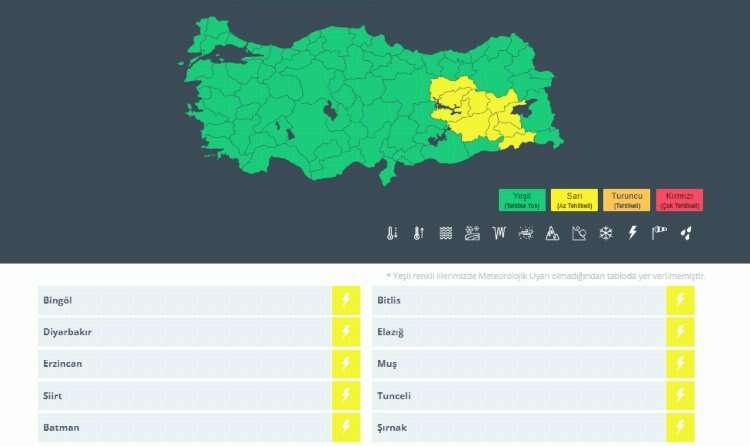 Meteoroloji Genel Müdürlüğünden alınan tahminlere göre yağışların; Adana’nın ve Osmaniye’nin güneyi, Hatay’ın kıyı kesimleri, Erzincan, Tunceli, Elazığ, Bingöl, Muş, Diyarbakır, Siirt, Batman, Şırnak ve Bitlis çevrelerinde yerel kuvvetli olması bekleniyor. Marmara, İç Ege, İç Anadolu’nun batısı ve Batı Karadeniz’in batısında sabah ve gece saatlerinde yer yer sis ve pus hadisesi bekleniyor.