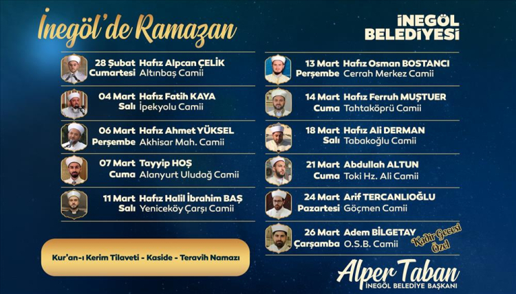 “Ramazan ayında bir önemli konumuz da Ramazan-ı Şerif’in ruhunu yansıtacak etkinlikler. Bu noktada Kültür ve Sosyal İşler Müdürlüğümüz ramazan ayında 11 farklı camide teravih programı ve 5 mahallemizde mahalle şenlikleri etkinlikleri gerçekleştirecek. Bu yıl da yine birbirinden kıymetli hafızlarımızı teravih programlarında farklı camilerimizde ilçe halkımızla buluşturacağız. Teravih programları kapsamında; 28 Şubat Cuma Alpcan Çelik ve Mevlidhan Mustafa Kaya hocalarımız Altınbaş Camisinde, 04 Mart Salı akşamı Fatih Kaya hocamız İpek Yolu Camisinde, 06 Mart Perşembe akşamı Ahmet Yüksel ile Mustafa Kaya hocalarımız Akhisar Mahallesi Camisinde, 07 Mart Cuma Tayyip Hoş hocamız Alanyurt Uludağ Camiinde, 11 Mart Salı akşamı Halil İbrahim Baş hocamız Yeniceköy Çarşı Camiinde, 13 Mart Perşembe akşamı Osman Bostancı hocamız Cerrah Merkez Camisinde, 14 Mart Cuma akşamı Ferruh Muştuer ile Mustafa Kaya hocalarımız Tahtaköprü Camiinde, 18 Mart Salı akşamı Ali Derman hocamız Tabakoğlu Camisinde, 21 Mart Cuma akşamı Abdullah Altun hocamız TOKİ Hz. Ali Camisinde, 24 Mart Pazartesi akşamı Arif Tecanlıoğlu hocamız Göçmen Camisinde, 26 Mart Çarşamba gecesi idrak edeceğimiz Kadir Gecesinde ise Adem Bilgetay ile Mustafa Kaya hocalarımız OSB camisinde İnegöl halkımızla buluşacak.”