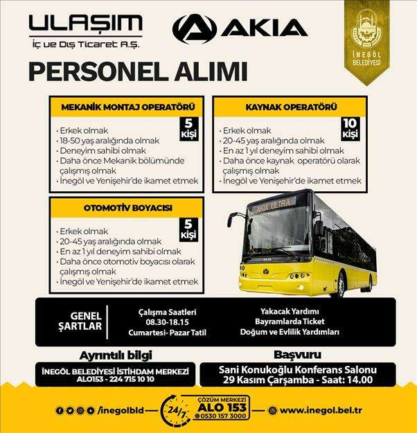 İnegöl Belediyesi İstihdam Merkezinden yapılan açıklamada, Hamzabey OSB’de üretimini sürdüren Akıa Ulaşım İÇ ve Dış Ticaret A.Ş. firmasında çalışmak üzere 20 erkek personel alımı yapılacağı duyuruldu. Açıklamada şu ifadelere yer verildi: “İstihdam Merkezimizle iş birliği yapan Akıa Otomotiv firması; 5 mekanik montaj bölümü, 10 kaynak operatörü ve 5 otomotiv boyacısı olmak üzere toplam 20 personel alımı yapacak. Mekanik montaj operatörü için; erkek, 18-50 yaş aralığında, deneyim sahibi, daha önce mekanik bölümünde çalışmış, İnegöl ve Yenişehir’de ikamet eden personeller alınacak. Kaynak operatörü alımı için de erkek, 20-45 yaş aralığında, en az 1 yıl deneyimli, daha önce kaynak operatörü olarak çalışmış, İnegöl ve Yenişehir’de ikamet eden personeller alınacak. Otomotiv boyacısı alanında ise erkek, 20-45 yaş aralığında, en az 1 yıl deneyim sahibi olan, daha önce otomotiv boyacısı olarak çalışmış, İnegöl ve Yenişehir’de ikamet eden personel alımı yapılacak. Firmanın belirttiği genel şartlara göre çalışma saatleri 08.30-18.15 olacak, Cumartesi ve Pazar günleri ise tatil. Çalışanlara yakacak yardımı, bayramlarda ticket ve doğum ile evlilik yardımları olacak.