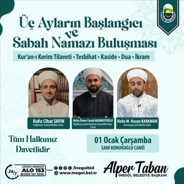 İnegöl Belediyesi, mübarek 3 ayların başlangıcını 1 Ocak Çarşamba sabahı sabah namazı buluşmasıyla karşılayacak. Başkan Alper Taban, tüm ilçe halkını konuk hafız ve imam hatiplerin yer alacağı buluşmaya davet etti.