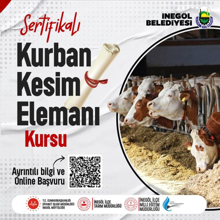Kurban kesim kursu için kayıtlar alınmaya başladı. Kurs tarihleri ise kayıt yoğunluğuna göre daha sonra belirlenerek duyurusu yapılacak. Kursa kayıt ve ayrıntılı bilgi ise İnegöl Halk Eğitim Merkezinden alınabilecek. Kurslar teorik eğitimlerle başladıktan sonra kursiyerlere kurban kesimi pratik eğitimlerde de gösterilecek.