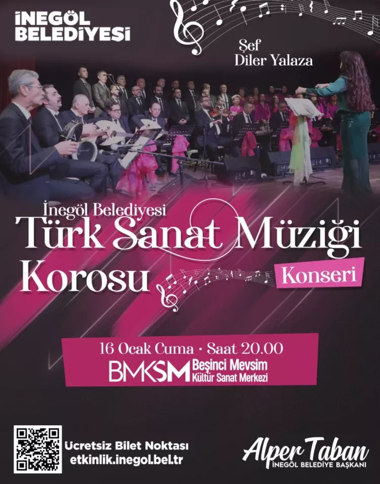 İnegöl Belediyesi Türk Sanat Müziği Korosu, Şef Diler Yalaza yönetiminde sahne alacak. Türk Sanat Müziği’nin hafızalara kazınan, seçkin eserlerinin seslendirileceği konser, 16 Ocak Cuma günü saat 20.00’de Beşinci Mevsim Kültür Sanat Merkezi’nde gerçekleştirilecek. Koro ve saz sanatçılarının güçlü performanslarıyla müzikseverlere unutulmaz bir akşam yaşatması hedefleniyor.