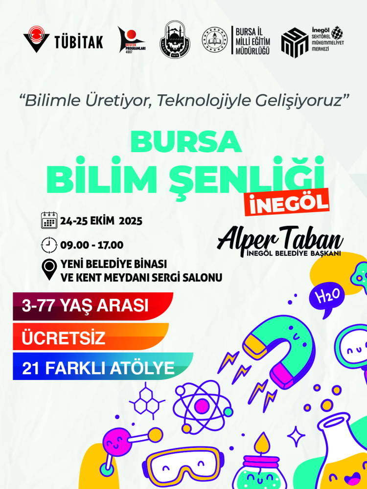 Bursa İl Milli Eğitim Müdürlüğü iş birliği ile TÜBİTAK 4007 Bilim Şenlikleri Destekleme Programı kapsamında düzenlenen “Bursa Bilim Şenliği: Bilimle Üretiyor, Teknolojiyle Gelişiyoruz” etkinliği, İnegöl Belediyesi ev sahipliğinde 2 gün boyunca içe halkıyla buluşacak. 24 Ekim Cuma ve 25 Ekim Cumartesi günleri yapılacak Bilim Şenliği, 3 yaştan başlamak üzere 77 yaşa kadar herkese hitap eden atölyelerle İnegöllüleri bilimle buluşturacak.