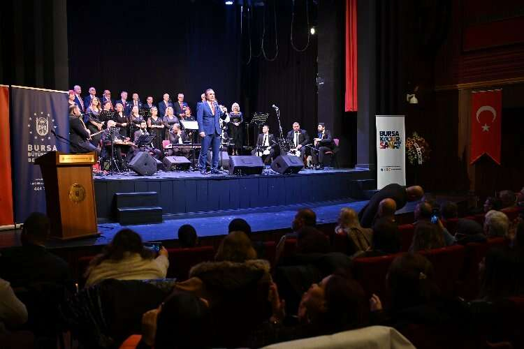 Bursa Muhtarlar Korosu’nun, 19 Ekim Muhtarlar Günü etkinlikleri kapsamında planlanan ancak İsrail’in Filistin’de uyguladığı soykırım nedeniyle ertelenen Türk Sanat Müziği Konseri, Tayyare Kültür Merkezi’nde yapıldı. Büyükşehir Belediyesi Orkestra Şube Müdürlüğü Çalgıcı Mektebi Roman Orkestrası eşliğinde sahne alan muhtarları, Bursa Büyükşehir Belediye Başkanı Alinur Aktaş, Yıldırım Kaymakamı Metin Esen ve çok sayıda müziksever dinledi. Serkan Kiviz’in şefliğinde Türk Sanat Müziği’nin sevilen eserlerini seslendiren muhtarlar, usta sanatçıları aratmadı. Muhtarlar, performanslarıyla dinleyicilerden bol bol alkış aldı.