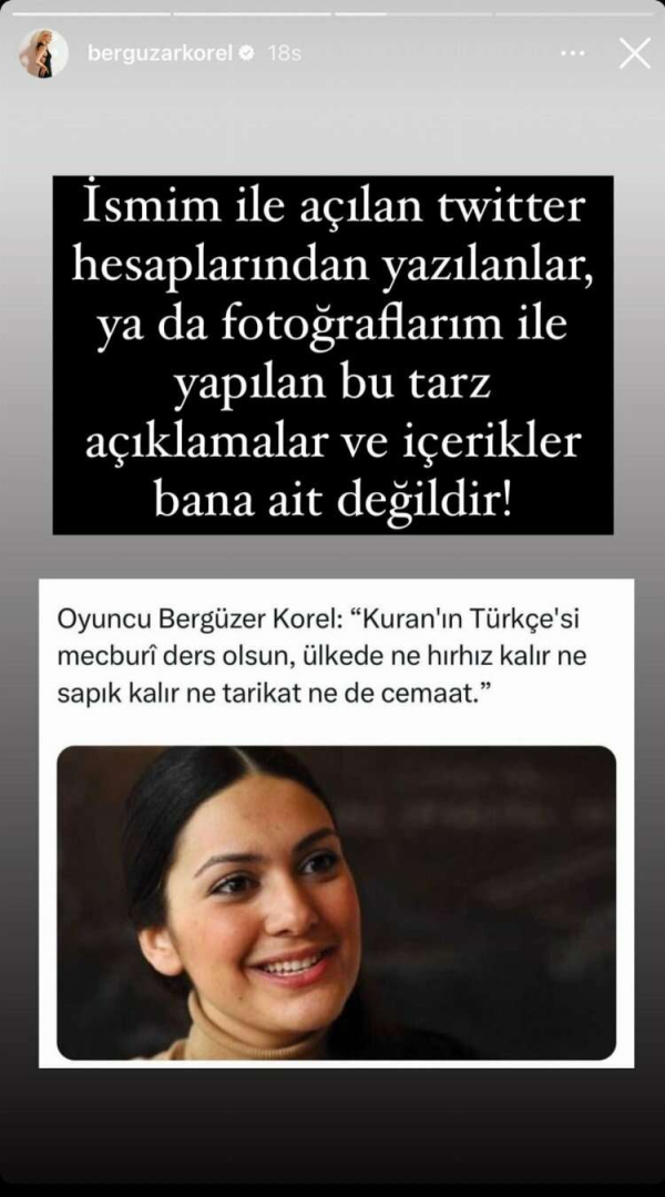 Ünlü oyuncu Bergüzar Korel'in geçen günlerde sosyal medya platformlarında "Kur'an'ın Türkçesi mecburi ders olsun, ülkede ne hırsız kalır ne tarikat ne cemaat" açıklamasında bulunduğu iddia edilmişti.