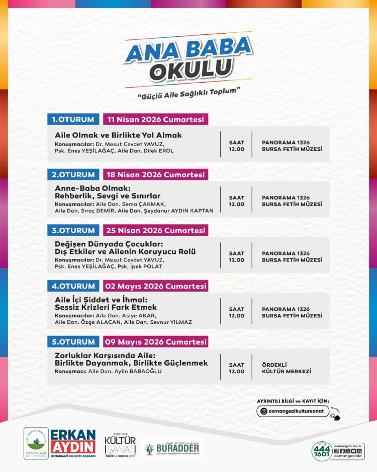 Osmangazi Belediyesi Kültür, Sanat ve Sosyal İşler Müdürlüğü’nün Bursa Aile Danışmanları ve Eğitimi Derneği iş birliğiyle 11 Nisan ile 9 Mayıs tarihleri arasında düzenleyeceği program, her Cumartesi saat 12.00’de gerçekleştirilecek. İlk dört oturum Panorama 1326 Bursa Fetih Müzesi’nde, final oturumu ise Ördekli Kültür Merkezi’nde yapılacak. Alanında uzman isimlerin katılacağı eğitimlerde; aile olmanın temel dinamiklerinden ebeveynlikte doğru sınırlar koymaya, çocukların değişen dünyadaki konumundan aile içi krizlerin fark edilmesine kadar pek çok önemli konu kapsamlı bir şekilde ele alınacak.
