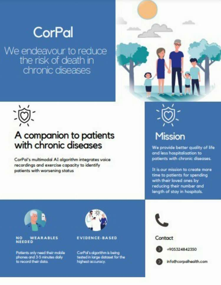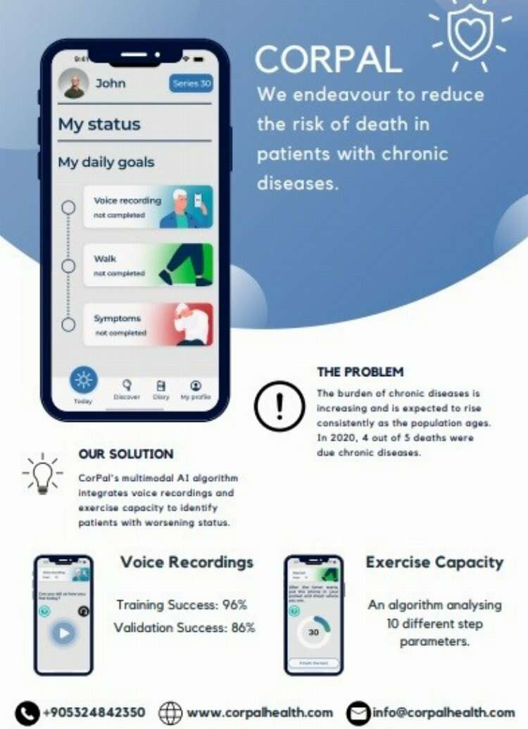 Kalp yetersizliği, diyabet, kanser, Alzheimer gibi uzun dönem takip gerektiren hastalıkların takibinde yapay zekâ destekli yenilikçi çözümler sunan CorPal girişimi, Türkiye’de ilk defa ses, adım ve hareket analizi ile hastalıkların kötüleşmesini erken dönemde tespit eden bir uygulama geliştirdi. Geliştirdiği çözümlerle CorPal, hastaların yaşam kalitelerini arttırmayı ve hastaneye yatışlarını azaltmayı hedefliyor.