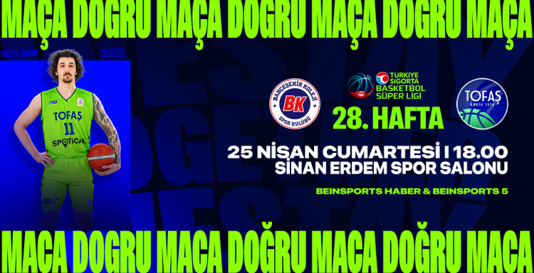 TOFAŞ Basketbol Takımı, ligin 28. haftasında Bahçeşehir Koleji’ne konuk olacak. 25 Nisan Cumartesi günü Sinan Erdem Spor Salonu’nda oynanacak maç saat 18.00’de başlayacak ve BeIN SPORTS Haber’den canlı yayınlanacak.