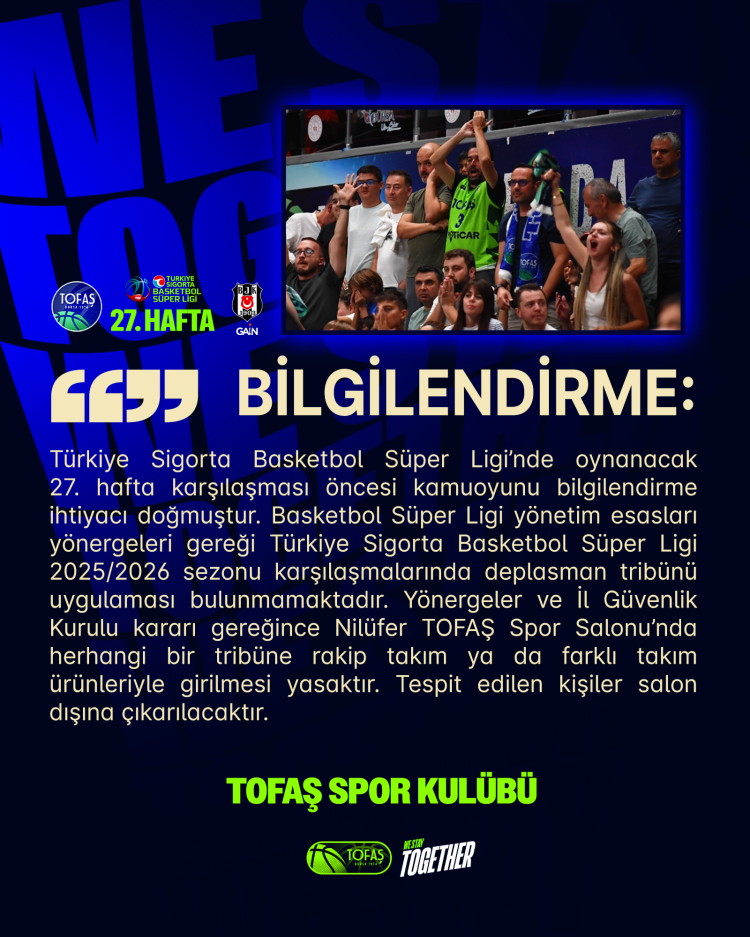 Basketbol Süper Ligi yönetim esasları yönergeleri gereği Türkiye Sigorta Basketbol Süper Ligi 2025/2026 sezonu karşılaşmalarında deplasman tribünü uygulaması bulunmamaktadır. Yönergeler ve İl Güvenlik Kurulu kararı gereğince Nilüfer TOFAŞ Spor Salonu’nda herhangi bir tribüne rakip takım ya da farklı takım ürünleriyle girilmesi yasaktır. Tespit edilen kişiler salon dışına çıkarılacaktır.